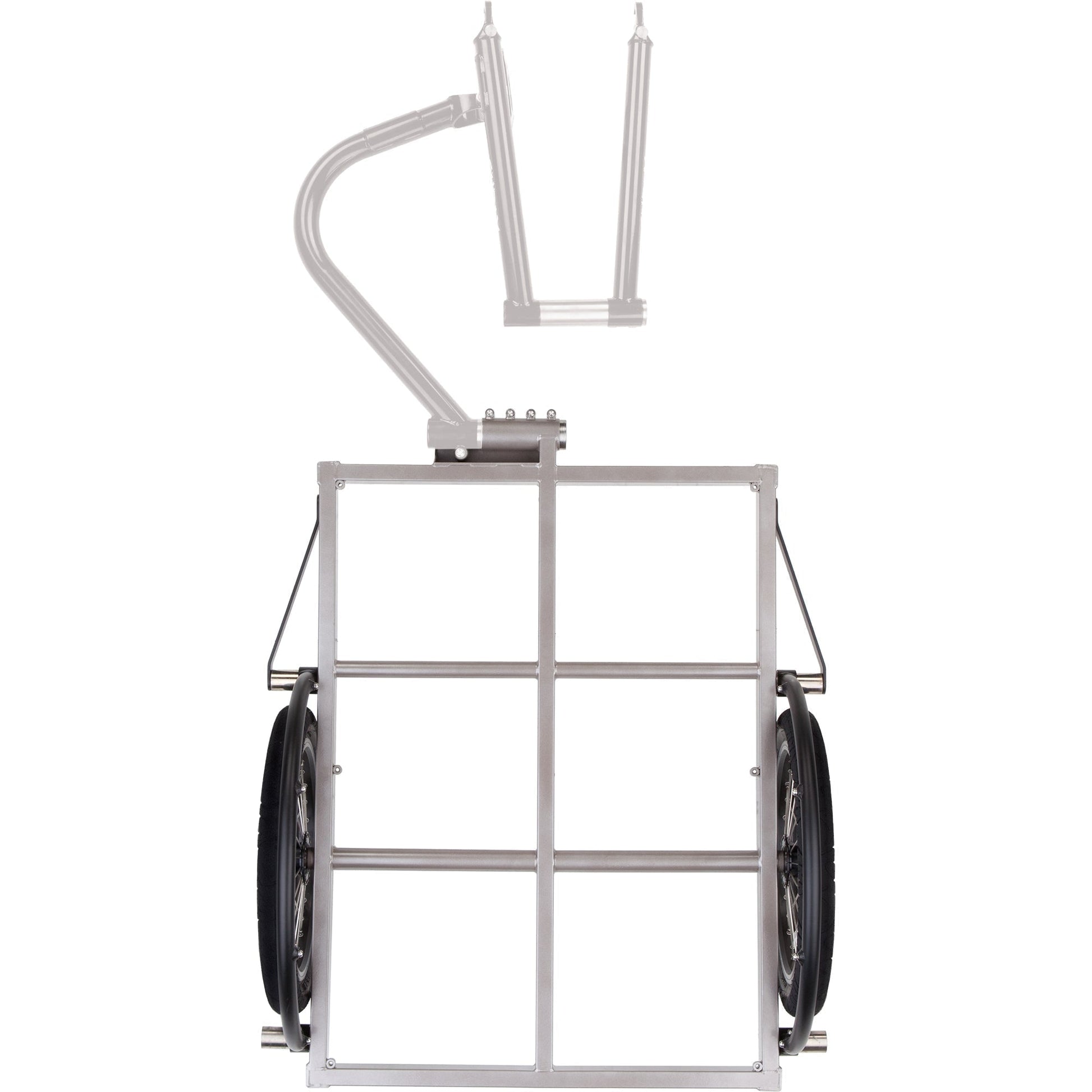 You are looking at our Ted trailer. It is 32” long and 24” wide. Ted is basically the same as our Bill trailer but shorter. It’s made of TIG-welded Chromoly steel for strength and long life. We’ve studied a lot of other trailers and thought about what we want out of a general purpose trailer. From its construction to all the details, we’re proud to offer you a trailer you can use for a long, long time to carry all kinds of stuff. When you don’t need it, it easily disconnects from your bike and when you’re ready to use it again it attaches just as quick and stays attached until you remove it.